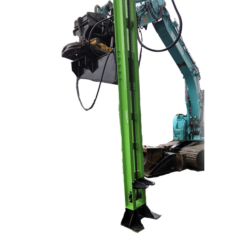 Der Pilot Boom PB ist ein robustes Anbaugerät für Bagger, das speziell für die kontrollierte und exakte Pfahlinstallation konzipiert wurde. Im Gegensatz zu frei hängenden Werkzeugen, die stark von der Erfahrung des Bedieners abhängen, sorgt das geführte System des Pilot Boom PB für exakte Vertikalität und gleichmäßige Kraftübertragung.